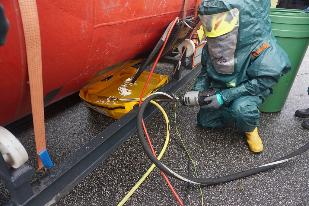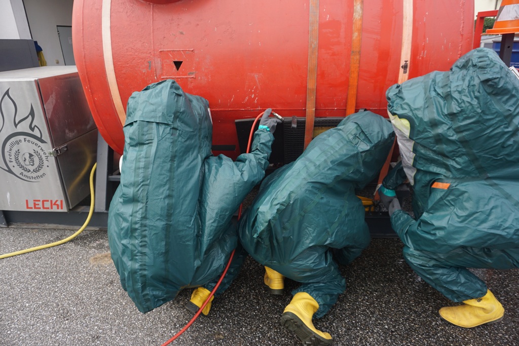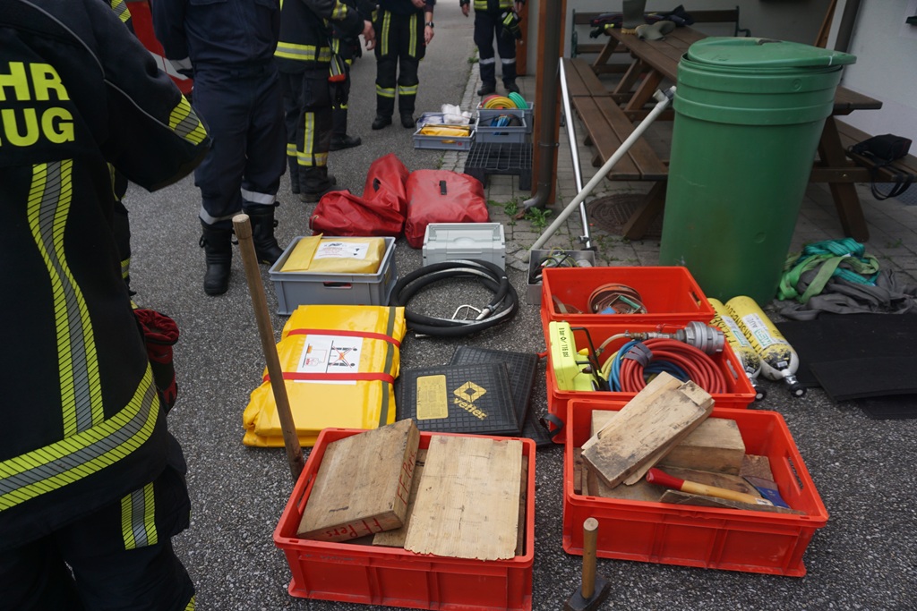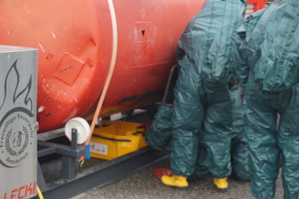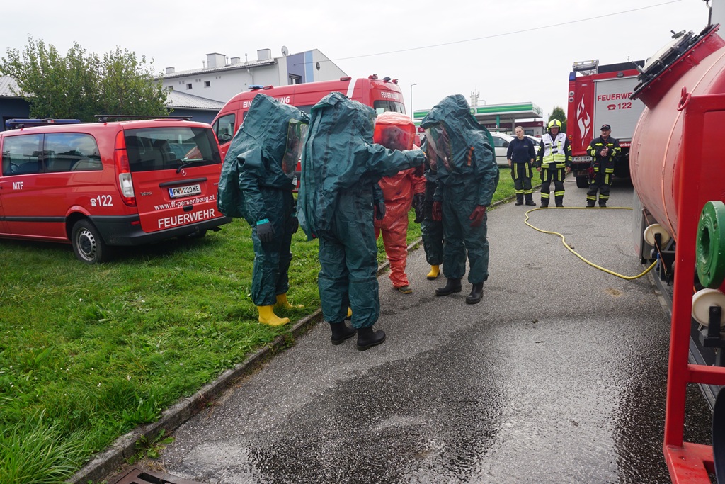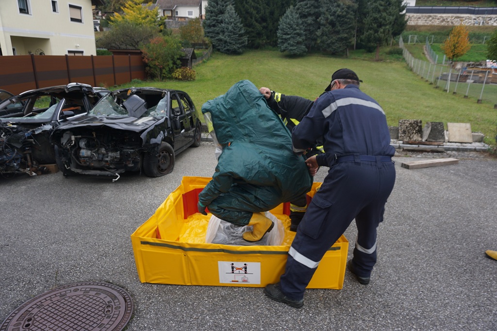 Mit 2 Trupps der Schutzstufe 2 wurde ein Szenario (Leck 5) mit den in den Feuerwehrfahrzeugen der FF Persenbeug und Weins-Ysperdorf vorhandenen Gerätschaften wie Dichtungsmitteln, Hebekissen, Auffangbehälter, Kanaldichtkissen etc, abgearbeitet. Auch Afkdt BR Rainer RUSA konnte sich ein Bild davon machen.