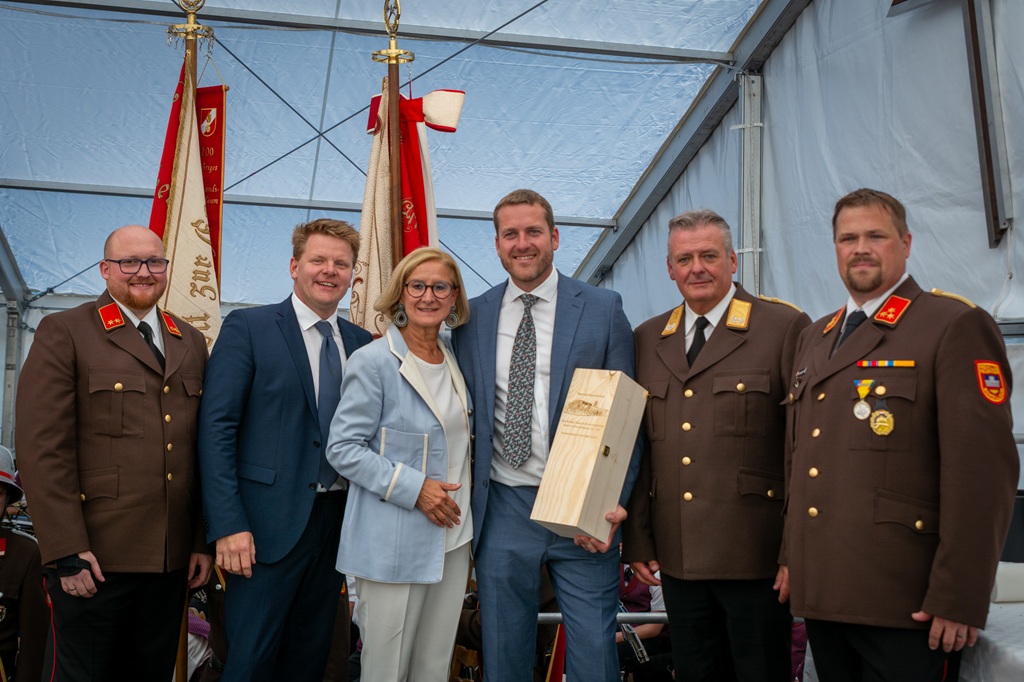 Altbürgermeister Walter Handl und Landeshauptfrau Johanna Mikl-Leitner, die dieses Projekt von Beginn an unterstützt haben. Er sprach den Verantwortlichen der fusionierten Wehren seinen großen Respekt aus und hob hervor, dass der Zusammenschluss und Neubau eine neue Begeisterung in der Feuerwehr ausgelöst haben: „Hier wächst eine starke, lebendige Gemeinschaft.“