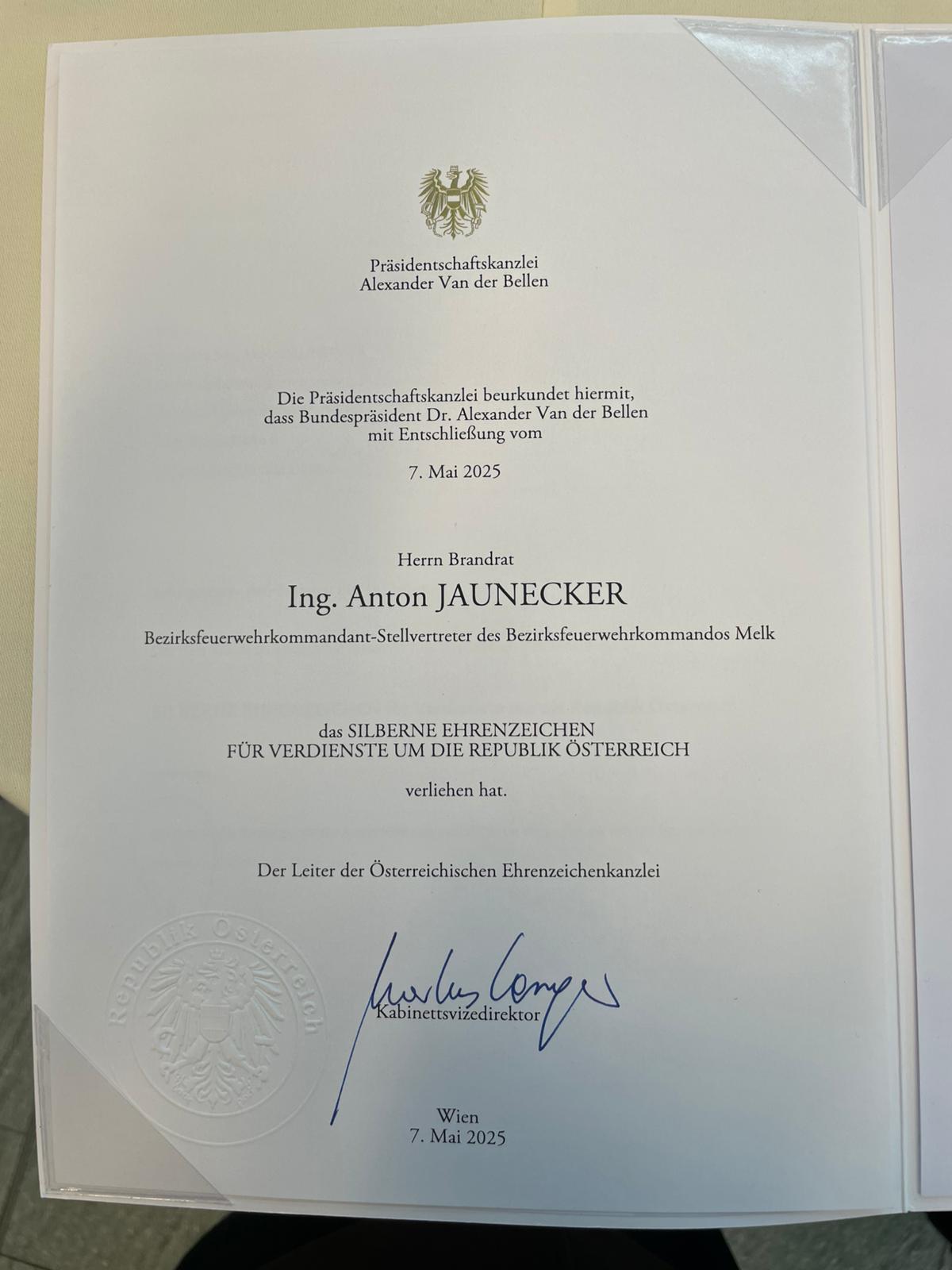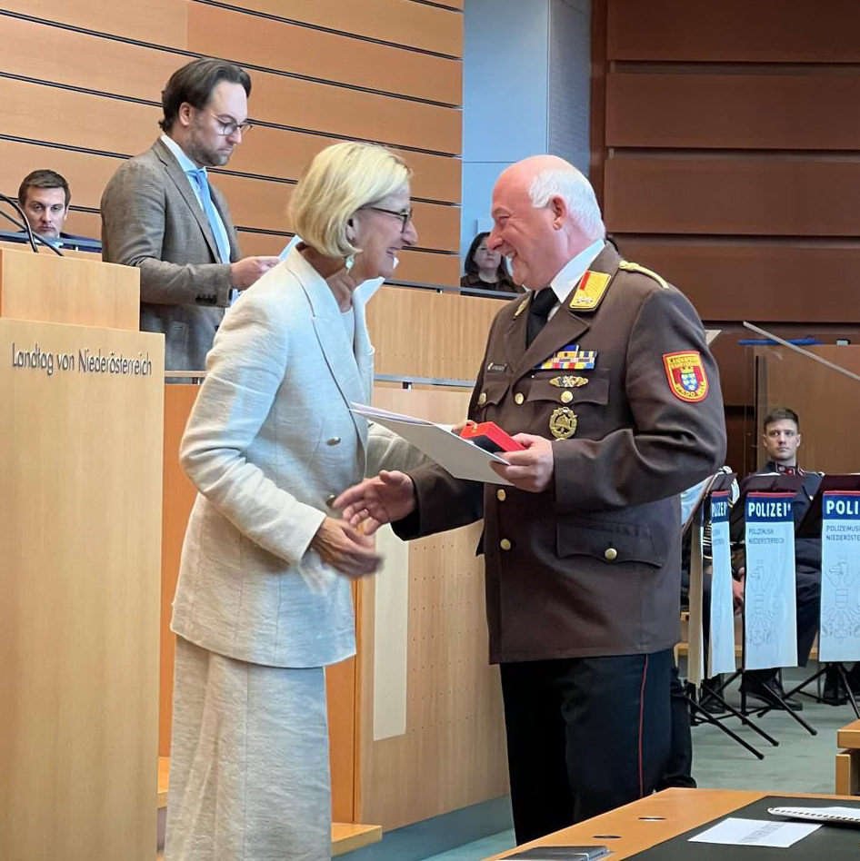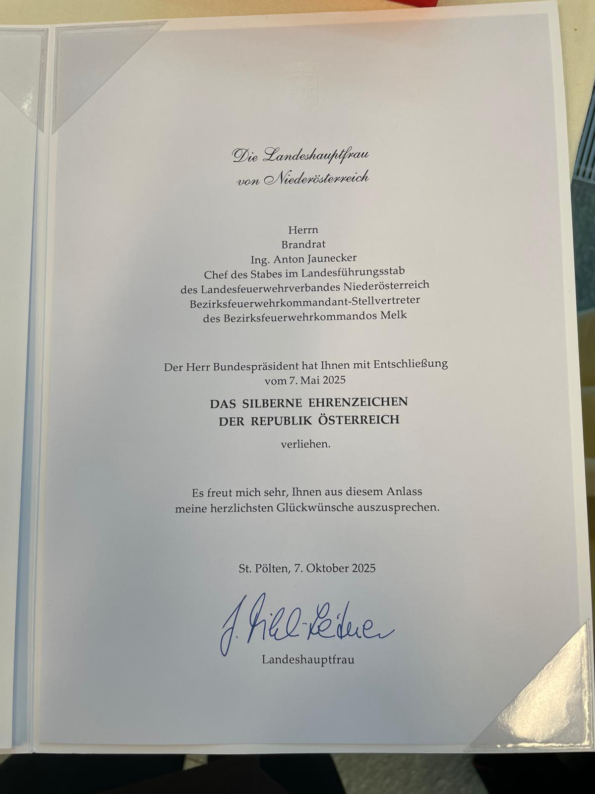 Die Landeshauptfrau von Niederösterreich überreichte Herrn Brandrat Ing. Anton Jaunecker - Chef des Stabes im Landesführungsstab des Landesfeuerwehrverbandes NÖ und Bezirksfeuerwehrkommandant-Stellvertreter des Bezirksfeuerwehrkommandos Melk