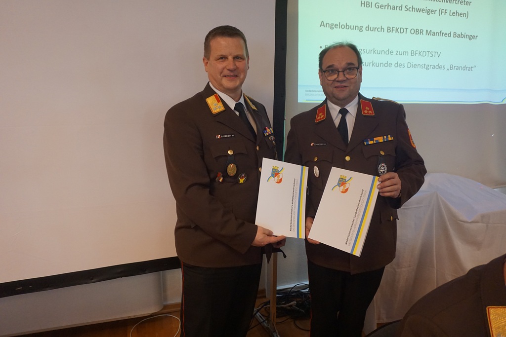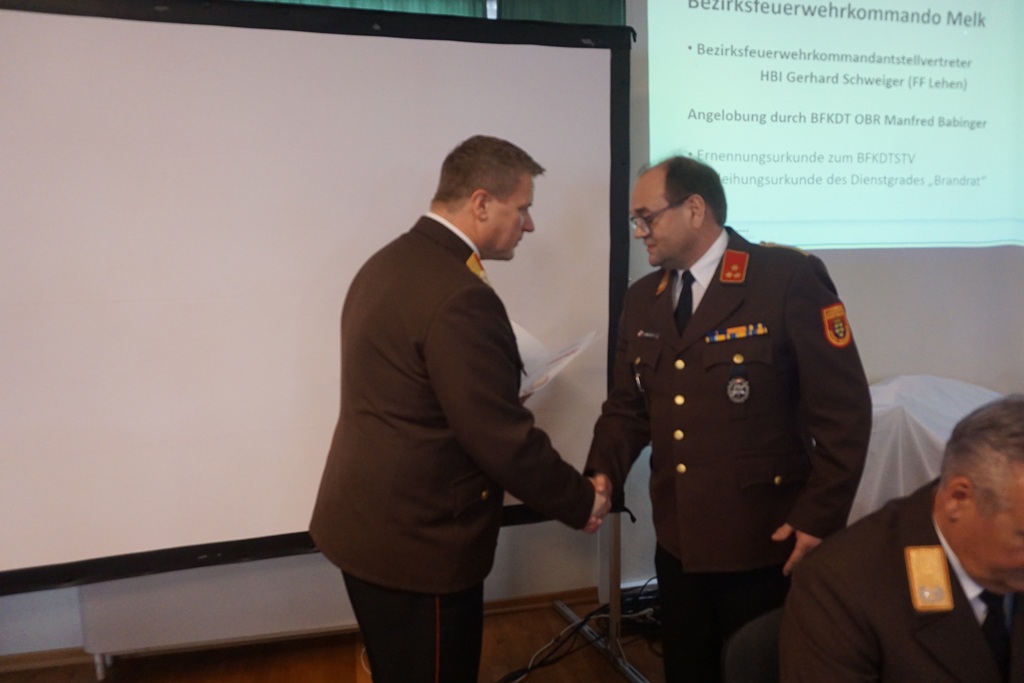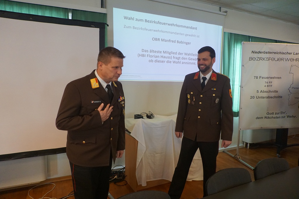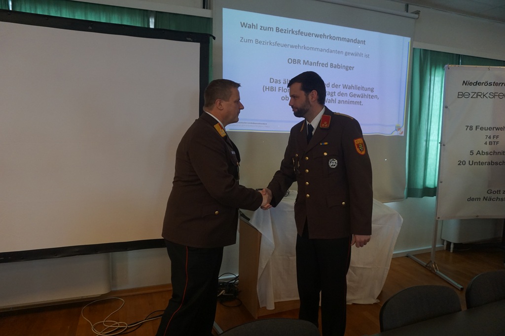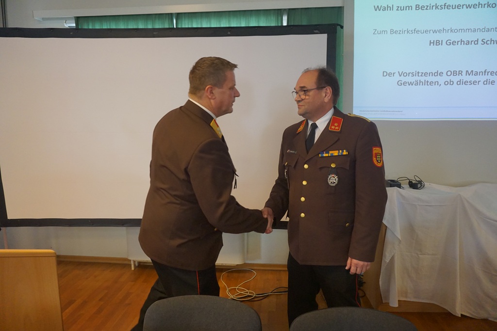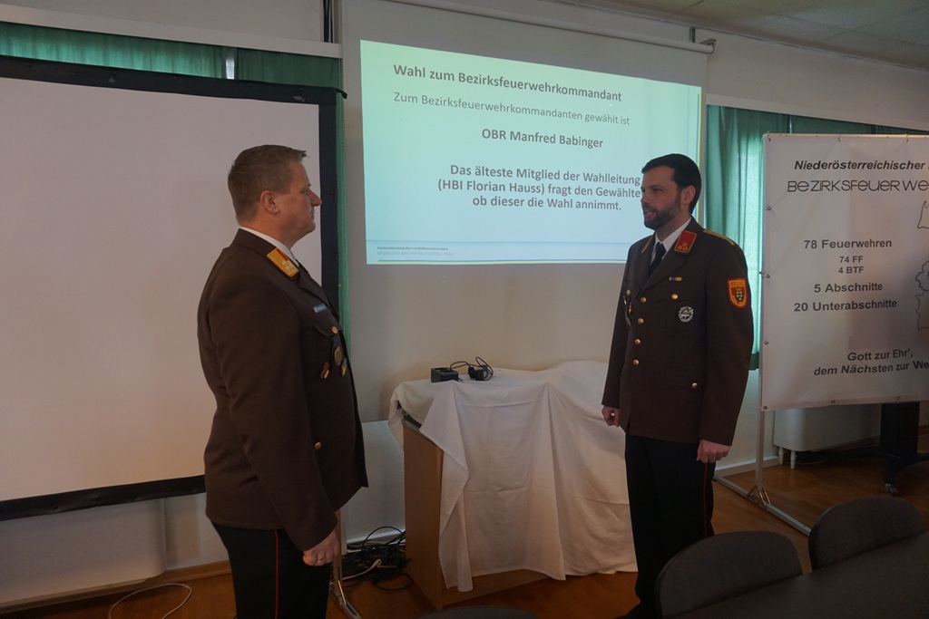 Zum Bezirksfeuerwehrkommandant wurde OBR Manfred Babinger wieder gewählt. Zur Wahl des Bezirksfeuerwehrkommandantenstellvertreters gab es 2 Wahlvorschläge (BR Hermann Mühlbacher und HBI Gerhard Schweiger), wobei HBI Gerhard Schweiger zum neuen Bezirksfeuerwehrkommandantenstellvertreter gewählt wurde.