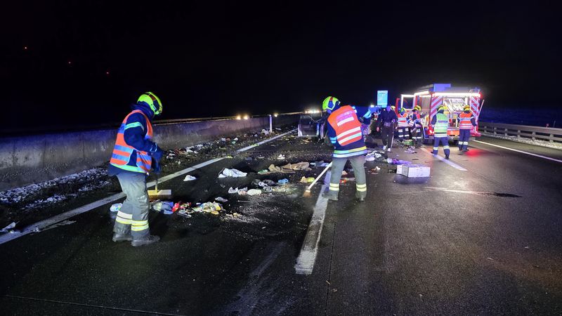 Durch Trümmerteile, die bei dieser Folge-Kollision entstanden, wurden weitere Fahrzeuge in Mitleidenschaft gezogen. Teile der Ladung trafen zudem zwei Fahrzeuge auf der Gegenfahrbahn, sodass letztlich insgesamt sechs Fahrzeuge in das Unfallgeschehen verwickelt waren. Insgesamt waren 12 Personen an dem Unfall beteiligt, zwei davon wurden mit Verletzungen unbestimmten Grades ins Krankenhaus gebracht.