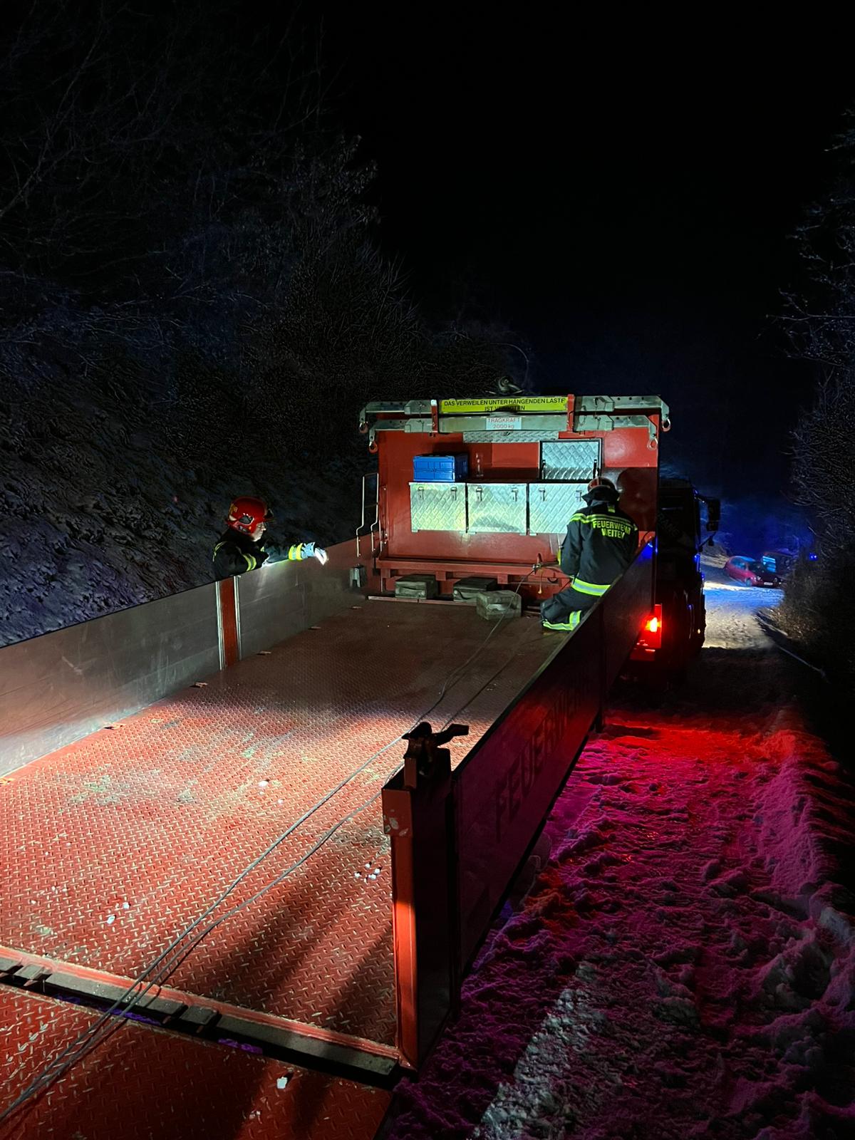 Ein PKW war aufgrund der winterlichen Fahrverhältnisse von der Fahrbahn abgekommen. Zwar gelang es dem Lenker, das Fahrzeug wieder auf die Straße zu manövrieren, dabei wurde der PKW jedoch so stark beschädigt, dass er nicht mehr fahrbereit war. Das Fahrzeug wurde auf das WLF-K verladen und gesichert abgestellt.