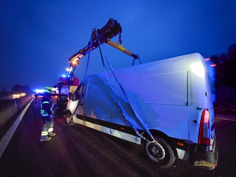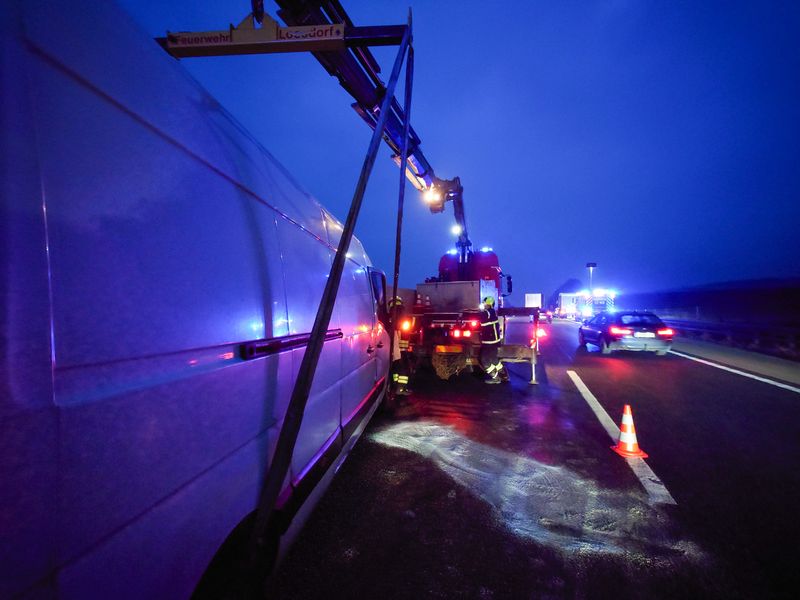 Beim Eintreffen der Einsatzkräfte zeigte die Lageerkundung ein anderes Bild: Ein Lkw und ein Kleintransporter waren in den Unfall verwickelt. Aus bisher ungeklärter Ursache fuhr der Kastenwagen auf einen Sattelauflieger auf, geriet ins Schleudern und kam schwer beschädigt auf der dritten Fahrspur zum Stillstand. Der Lkw wurde lediglich leicht beschädigt.
